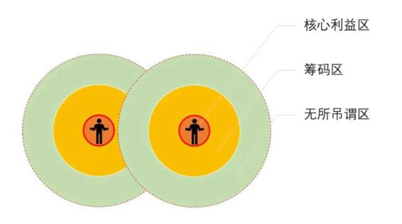 正如上图,两个人的表观边界貌似发生了碰撞,如果双方不去试探,看起来是没法达成合作的; 但我们都知道,实际上二者的真实边界/硬边界是没有冲突的,甚至连“筹码区